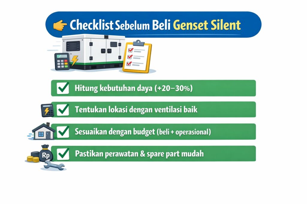 Sebelum membeli genset silent, ada beberapa hal penting yang sebaiknya dicek agar tidak salah pilih. Mulai dari kebutuhan listrik, lokasi penempatan, hingga biaya dan perawatan, semuanya akan berpengaruh terhadap kenyamanan dan efisiensi penggunaan dalam jangka panjang.